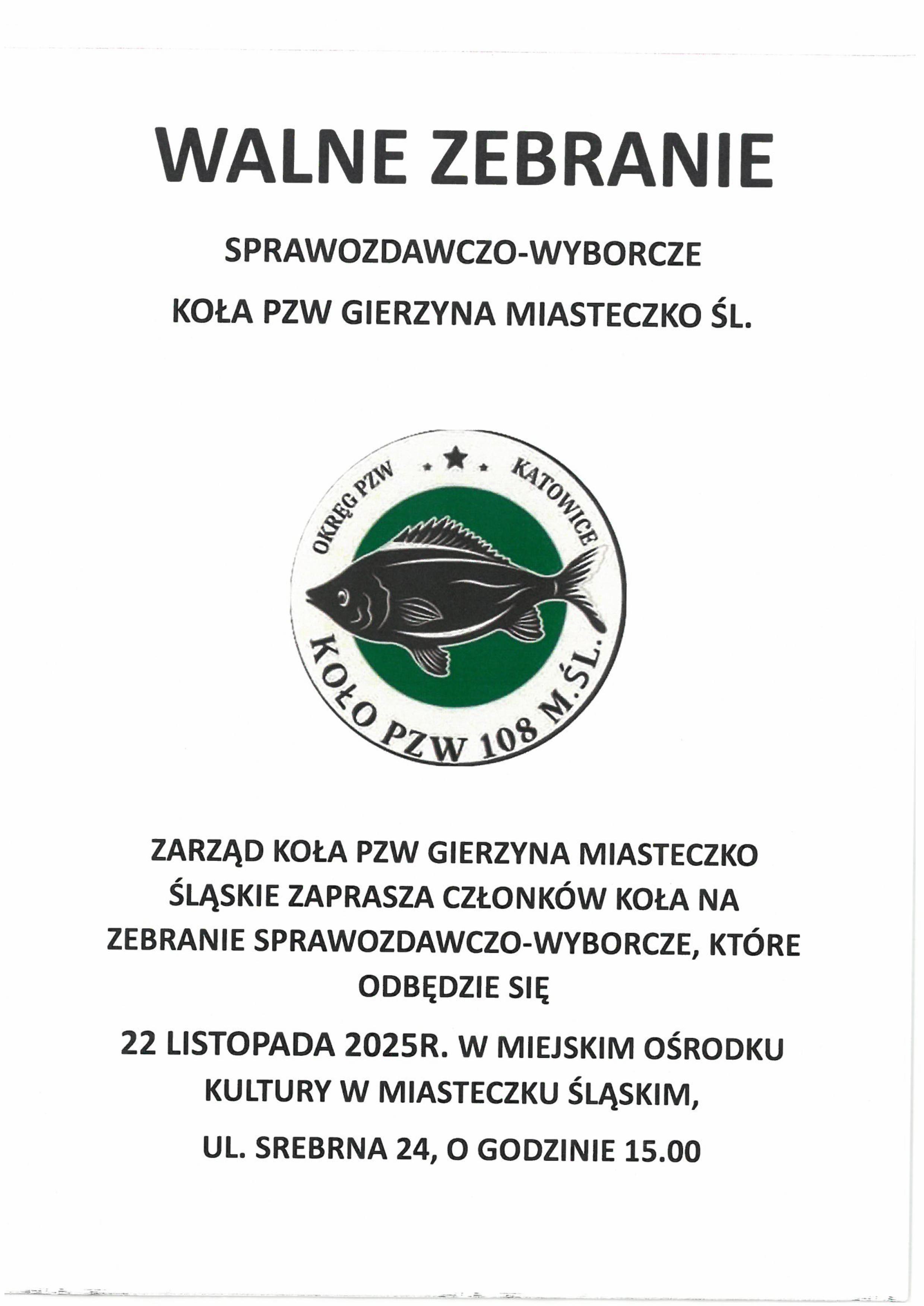 Zarząd Koła PZW Gierzyna Miasteczko Śląskie zaprasza na Walne Zebranie Sprawozdawczo-Wyborcze Koła PZW Gierzyna Miasteczko Śląskie.