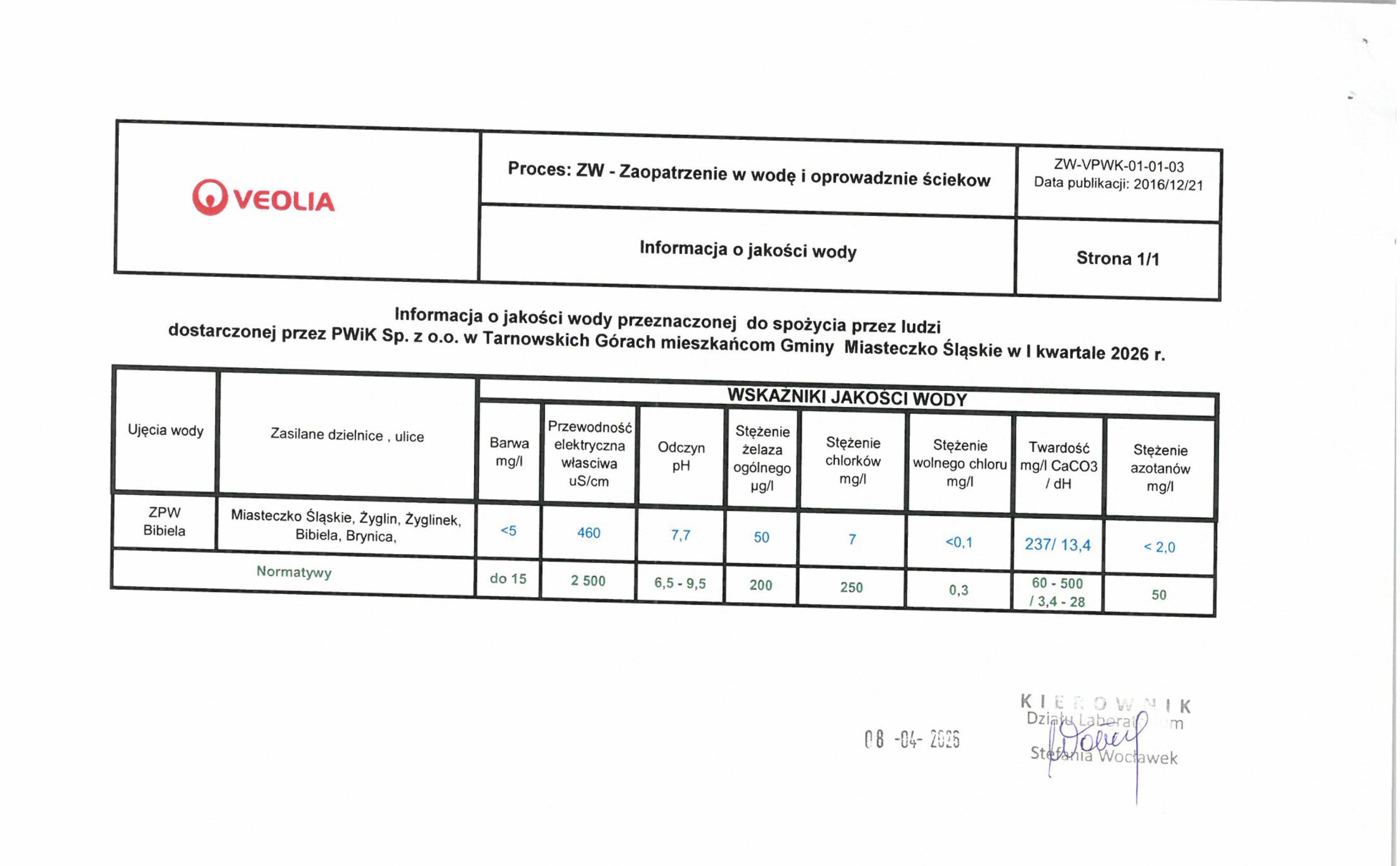 Na podstawie informacji przekazanej przez PWiK Sp. z o.o. w Tarnowskich Górach, w I kwartale 2026 r. woda dostarczana mieszkańcom Gminy Miasteczko Śląskie (Miasteczko Śląskie, Żyglin, Żyglinek, Bibiela, Brynica) z ujęcia ZPW Bibiela spełniała wymagania jakościowe dla wody przeznaczonej do spożycia przez ludzi.